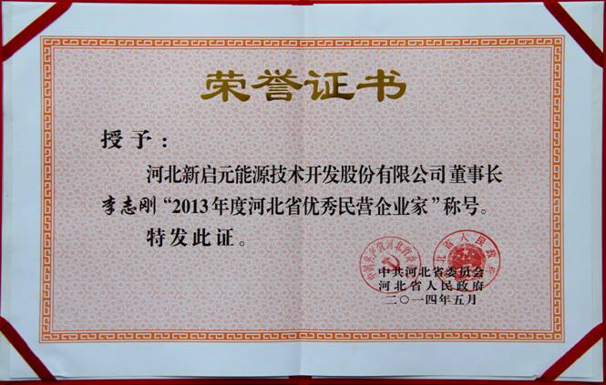 6月5日,中共河北省委、河北省人民政府授予新啟元公司“河北省2013年度百強民營企業(yè)”榮譽稱號。授予新啟元公司董事長李志剛“2013年度河北省優(yōu)秀民營企業(yè)家”榮譽稱號。