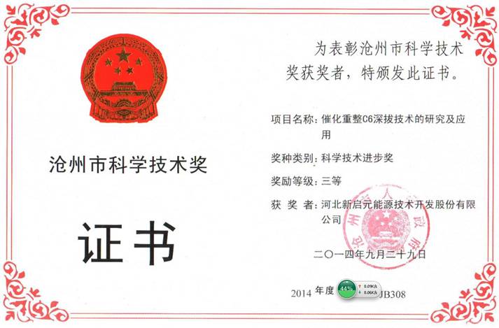 2014年10月13日河北新啟元能源技術(shù)開(kāi)發(fā)股份有限公司獲得滄州市科學(xué)技術(shù)獎(jiǎng)三等獎(jiǎng),獲獎(jiǎng)項(xiàng)目為《催化重整C6深拔技術(shù)的研究及應(yīng)用》。項(xiàng)目主要完成人李志剛、喬樹(shù)華、劉海軍、劉立新、鄭擁軍。