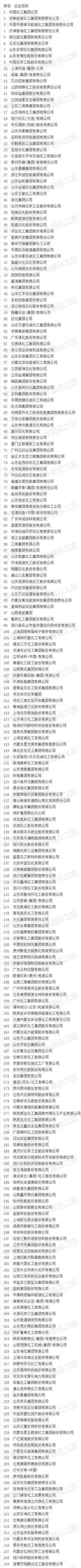 排在榜單前十名的企業(yè)分別為中國(guó)化工集團(tuán)公司、河南能源化工集團(tuán)有限責(zé)任公司、中國(guó)平煤神馬能源化工集團(tuán)有限責(zé)任公司、天津渤?;ぜ瘓F(tuán)有限責(zé)任公司、湖北宜化集團(tuán)有限責(zé)任公司、云天化集團(tuán)有限責(zé)任公司、山東東明石化集團(tuán)有限公司、山東京博控股股份有限公司、中國(guó)化學(xué)工程股份有限公司、上海華誼(集團(tuán))公司。