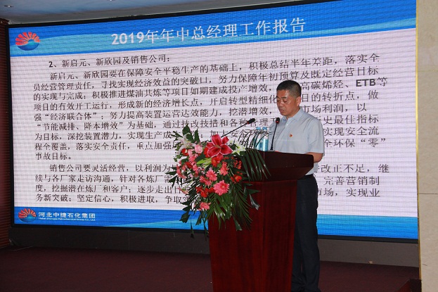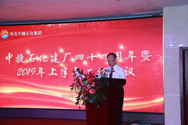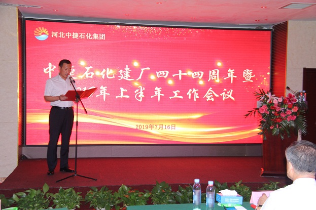 7月16日上午9:30,河北中捷石化集團(tuán)在華悅凱旋大酒店4樓宴廳隆重召開建廠44周年暨2019年上半年工作會議,集團(tuán)公司董事長王振華、總經(jīng)理喬樹華等集團(tuán)領(lǐng)導(dǎo)及各級管理人員共計74人參加會議,整個大廳座無虛席。大會由集團(tuán)公司黨委書記于國臣同志主持。