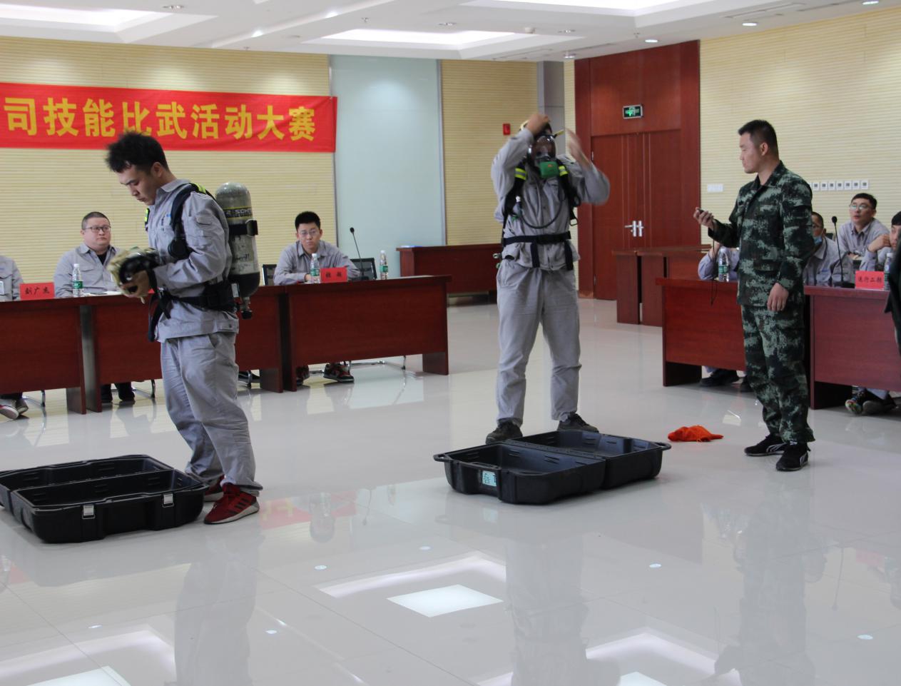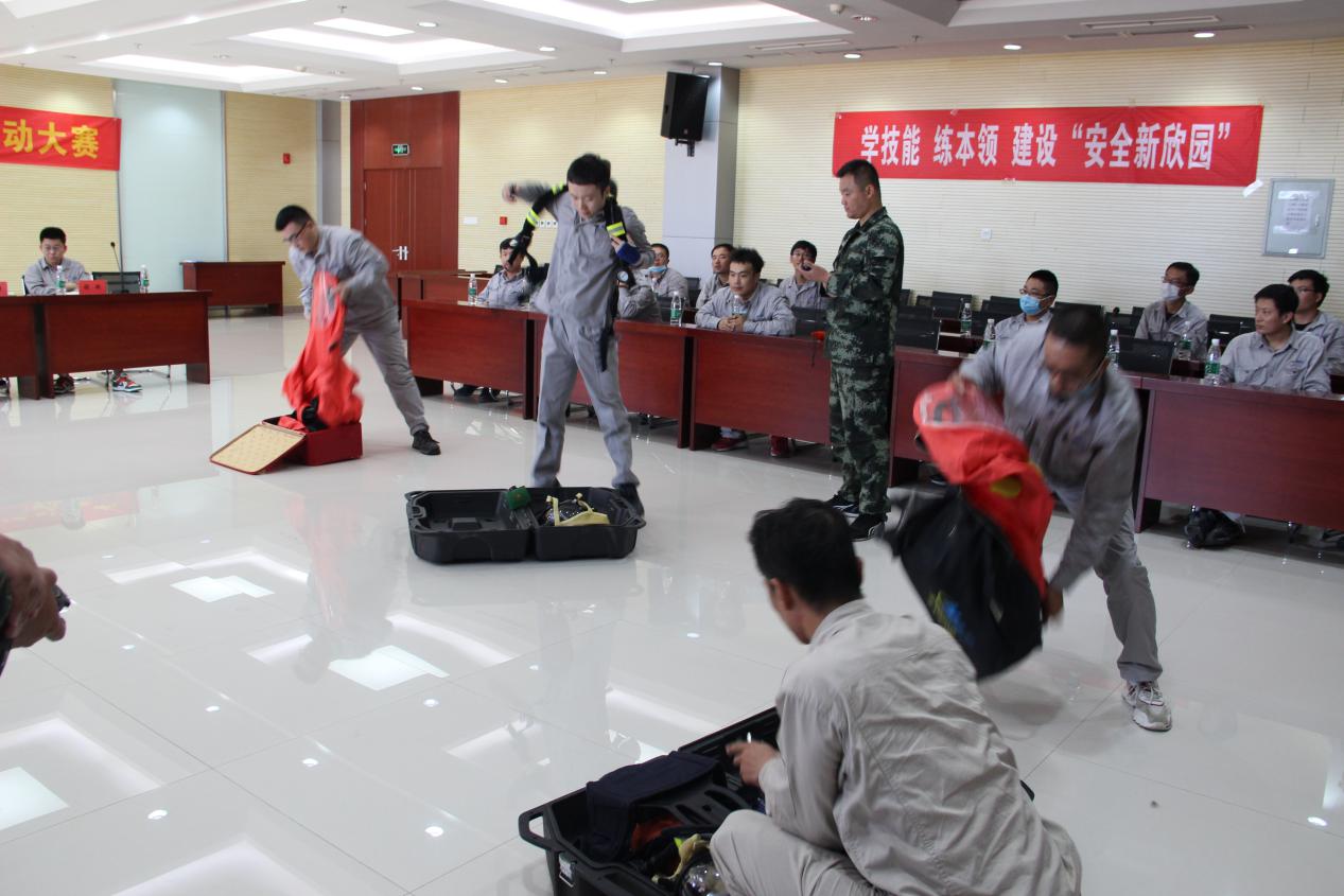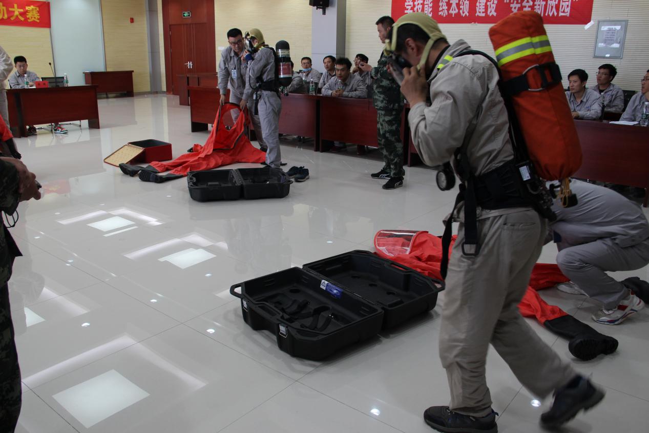 本次比賽分為“正壓式空氣呼吸器佩戴、防化服穿戴、安全知識問答”三個項目。在主持人發(fā)出“開始”口令后,選手們個個奮勇爭先,都拿出了自己的看家本領(lǐng),展現(xiàn)精湛的“武技”,將活動氛圍推向高潮。經(jīng)過緊張激烈的角逐,最終運行二部張賽以18秒03的成績獲得正壓式空氣呼吸器佩戴項目的冠軍,運行一部王圣濤、馬帥以35秒71的優(yōu)異成績奪得防化服穿戴項目的冠軍。