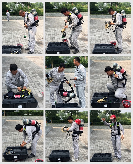 第四周為“應(yīng)急器材技能比武”活動(dòng)周。此次比武的內(nèi)容是“空氣呼吸器穿戴”。該項(xiàng)目重點(diǎn)檢驗(yàn)員工對(duì)空氣佩戴裝置、氣瓶壓力、報(bào)警閥、面罩以及呼吸閥的檢查,對(duì)呼吸器佩戴操作的熟練性和連貫性等。參賽選手緊抓比賽要點(diǎn),梳理檢查、佩戴、調(diào)整、確認(rèn)四個(gè)操作環(huán)節(jié)。比賽期間,參賽選手們不時(shí)對(duì)佩戴技巧和要點(diǎn)難點(diǎn)進(jìn)行交流,共同探討如何提升技能。