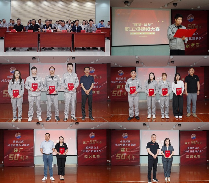 集團公司訊 為熱烈慶祝建廠50周年,在系列活動中傳承企業(yè)精神,激發(fā)全員學(xué)習(xí)熱情,助力持續(xù)穩(wěn)定創(chuàng)新發(fā)展,6月20日上午,集團公司在新欣園公司中控室二樓會議室舉辦了“中捷石化知多少”知識競賽暨“逐夢·筑夢”職工短視頻大賽頒獎活動。集團公司總經(jīng)理喬樹華、副總經(jīng)理王猛、財務(wù)總監(jiān)宋立峰、總工程師李金馬、紀委書記朱振江、工會主席牛旭宗,各單位總經(jīng)理、員工代表及參賽職工共計80余人參加。