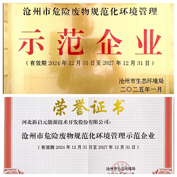新啟元公司一直重視環(huán)境保護工作,在中捷產(chǎn)業(yè)園區(qū)作為行業(yè)標桿被表揚和推廣,曾組織園區(qū)涉危險廢物企業(yè)負責人來我廠觀摩參觀。2024年滄州市生態(tài)環(huán)境局組織對全市涉危險廢物企業(yè)的評估評審,歷經(jīng)幾輪檢查,我公司一直名列前茅,最終被滄州市生態(tài)環(huán)境局評為“滄州市危險廢物規(guī)范化環(huán)境管理示范企業(yè)”。
